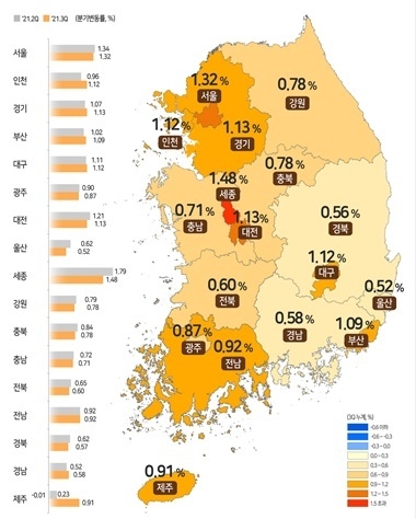 제주는 0.91%의 상승률을 기록했고, 광역시에서는 대전이 1.13%, 대구 1.12%, 인천 1.12%, 부산이 1.09%의 상승률을 보였다.