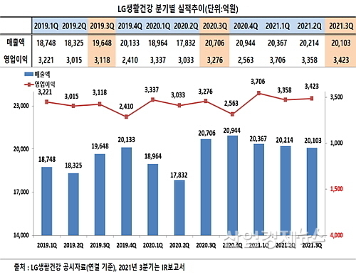 LG생활건강이 밝힌 연결재무제표 기준 올 3분기 잠정실적(IR자료)에 따르면 전사 3분기 매출은 2조103억 원으로 전년 동기 2조706억 대비 603억이 줄어 2,9% 가량 감소했다. 이는 코로나19 초기인 2020년 2분기에 기록했던 1조7832억 원 이후 5분기 만에 가장 적은 수치다.
