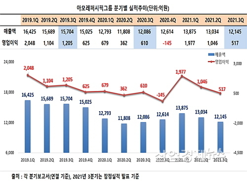 [산업경제뉴스 민경종 기자] 아모레퍼시픽그룹(아모레G)의 올 3분기 실적이 직전 분기 대비 외형과 손익 모두 뒷걸음질 친 것으로 밝혀졌다.