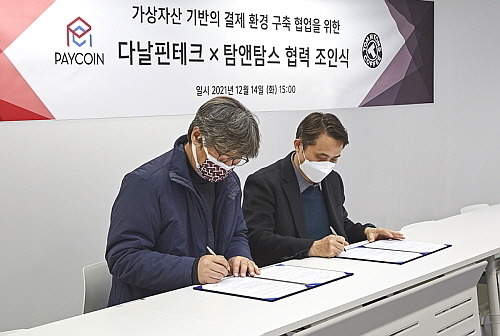 지난 13일 경기도 성남시 다날핀테크 본사에서 ‘가상자산 기반의 결제 환경 구축 협업을 위한 다날핀테크X탐앤탐스 협력 조인식’을 진행한 것인데,