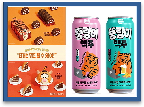 아모레퍼시픽의 뷰티 브랜드 ‘한율’이 호랑이 민화 컬렉션을 한정 출시한데 이어 CJ푸드빌 뚜레쥬르는 디즈니 캐릭터 ‘티거’를 모티프로 한 케이크 제품을, 또 국내 수제맥주 대표 기업 세븐브로이맥주㈜는 무직타이거, 세븐일레븐과 협업한 ‘뚱랑이 맥주’를 각각 선보인 것.