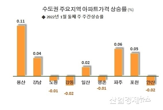 지난주에는 서울의 노원구와 강동구가 -0.01%, -0.02%로 가격이 하락했고, 신도시 가운데는 평촌이 -0.01%, 경기인천지역에서는 안산이 -0.02%의 주간상승률을 기록하며 가격이 하락했다.