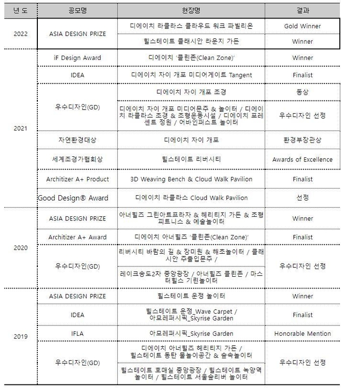 [산업경제뉴스 최기훈 기자] 현대건설의 아파트 조경 설치물이 최근 국제 디자인 대회에서 연이어 수상 소식을 전하고 있다. 지난해에 이어 올해도 '아시아 디자인 프라이즈'에서 2관왕의 영예를 안았다.