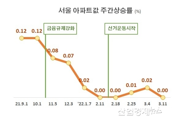 지난 9일 선거가 끝나고 국민의힘 윤석열 후보가 당선자로 확정됐다. 어느 후보보다 규제완화를 강력하게 주장했던 윤 후보가 당선되면서 시장에서는 시장활성화에 대한 기대감이 더 높아졌다. 하지만, 당선자가 확정된 지난주 주택시장은 오히려 거래가 실종되면서, 가격 상승률도 0.00%를 나타내며 상승도 하락도 하지 않았다.