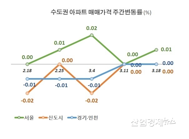 신도시 아파트가격은 대선 전 마이너스를 오르내리다 대선 이후 보합세로 올라섰고, 경기인천 지역도 -0.01%의 하락세를 보이다 대선 후에 보합세로 올라섰다.