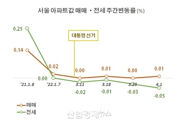 [산업경제뉴스 문성희 기자] 차기 정부가 임대차3법을 폐지 또는 축소하려는 움직임을 보이고 있는 가운데, 서울과 수도권의 전세가격은 대통령선거 이후 계속 하락세가 더 커지고 있다. 반면 매매가격은, 지난해 10월 금융규제 이후의 하락세에서 상승세로 전환되는 모습이다.