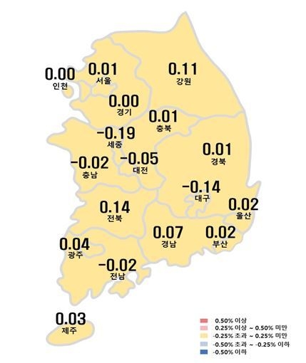 세종이 -0.26, 대구 -0.18, 대전 -0.06%의 하락세를 보였지만, 대도시를 제외한 지역은 경남 0.10%, 전북 0.09%, 강원 0.06% , 경북 0.05%로 상승세를 지속했다.