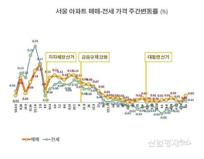 부동산114에 따르면 지난주 서울 아파트가격은 0.03%의 상승률을 보이며 대선후 0.00~0.01%를 오가던 상승률 곡선이 우상향됐다. 신도시도 그동안 하락과 보합을 오고갔지만 지난주에는 0.03%로 상승세를 보였다.