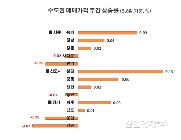 지난주 서울과 신도시는 상승세를 보인 반면, 경기인천 아파트는 상승세와 하락세가 교차했다. 송파는 올림픽아파트, 잠실 우성 등이 1,500~5,000만원 오르면서 주간상승률 0.09%를 기록했고, 강남도 압구정현대, 개포우성 등 재건축 아파트가 2,500~5,000만원 오르면서 0.04% 상승률로 굳건한 오름세를 지속하고 있다.