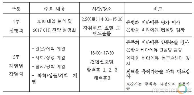 이날 행사는 1부 행사로 ‘2016 대입분석 및 2017 대입설명회’가 강원랜드호텔 그랜드볼룸에서 2명의 전문 강사가 강연할 예정이며, 2부 행사는 컨벤션호텔에서 4개 계열 간담회(인문/어학계열, 사회/상경계열, 물리/공학계열, 화학/생물/의학계열)를 4명의 전문 강사가 각각 나뉘어서 진행할 계획이다.