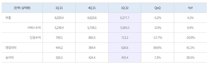 서비스 매출은 연결 기준 6.4% 성장한 5조5,655억, 별도 기준은 3.6% 성장한 3조9,621억원을 기록했다.
