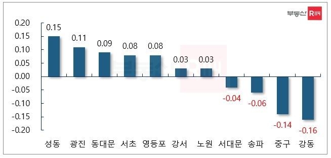 하지만 강동은 -0.16%, 중구는 -0.14%의 상승률을 보이며 가격이 급락하는 모습을 보였고, 송파도 -0.06%, 서대문 -0.04%의 상승률을 보이며 마이너스 상승률을 기록했다.