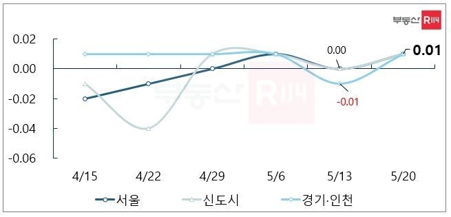반면 서울의 매매가격 상승률은 0.01%로 전세가격상승률과 동일했지만, 신도시는 0.00%, 경기인천은 -0.01%의 하락세를 보이며 상승세로 돌아선 전세가격보다 낮은 수치를 보였다.