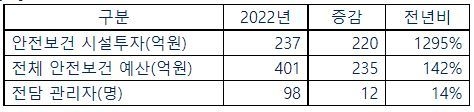 - 안전보건 예산 : 401억원(전년비 142% 증가)