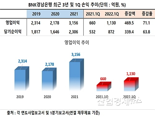 이러한 호 실적은 1분기에도 이어졌다. 1분기 보고서에 따르면 경남은행은 1130억 원의 영업이익과 872억의 순이익을 시현, 전년 동기 660억 원과 532억 대비 각각 71.1%와 63.8% 급증했다.