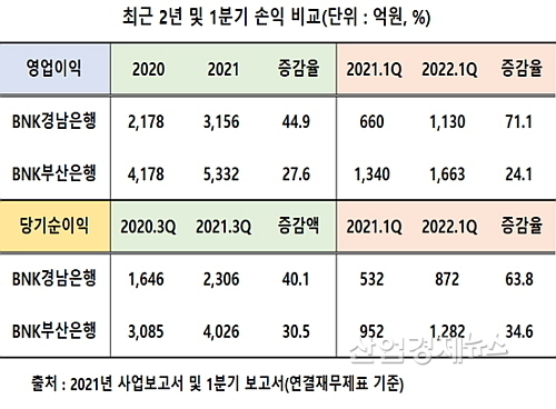 경남은행과 부산은행의 1분기 손익 성적도 경남의 완승이다. 영업이익 증가율에서 약 47.0% 포인트(경남 71.1%-부산 24.1%) 앞섰고, 순이익 역시 약 29.2%P(경남 63.8%-부산 34.6%)이나 크게 앞선 손익성적표를 작성해 냈다.