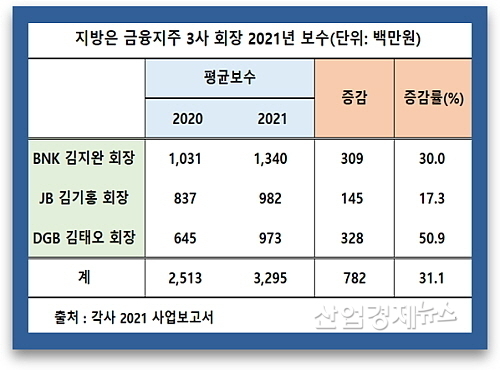 [산업경제뉴스 민경종 기자] 영·호남 지역을 각각의 주된 영업기반으로 하는 지방은행금융지주 3사 회장의 지난해 평균보수가 공시돼 눈길을 모으고 있다.