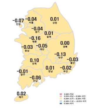 서울은 -0.04%, 인천 -0.07%, 경기 -0.04%, 대전 -0.05%로 상반기와 비슷한 흐름을 보이고 있으며, 상반기에 상승세를 보였던 부산이 지난주에는 -0.02%, 하락세로 전환됐다.