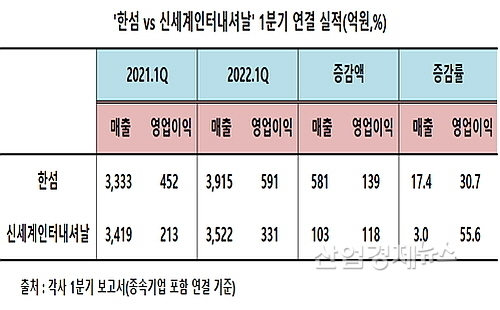 매출 증가율에선 현대백화점그룹 소속 한섬이, 영업이익 증가율에선 신세계그룹 소속 신세계인터내셔날이 상대방보다 더 양호한 성적표를 작성한 것.