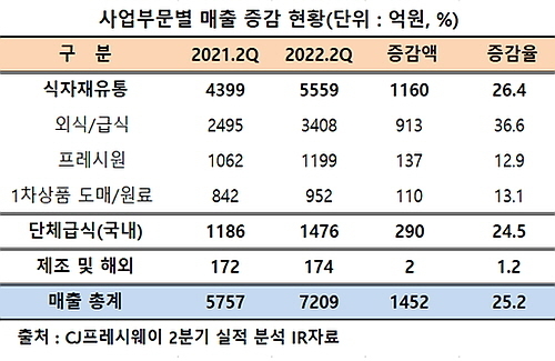CJ프레시웨이가 밝힌 2분기 실적 IR자료에 따르면 먼저 주력사업인 식자재유통 매출은 약 5559억 원으로 전년 동기 4399억 대비 약 26.4% 증가했다.