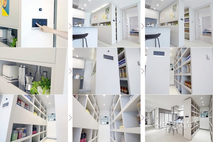 현대건설이 개발한 ‘트랜스포밍 월&퍼니처’는 상하부 레일 없이 버튼 하나로 이동이 가능하며, 벽체를 이동시켜 안쪽에서 식료품을 꺼낼 수 있다. 벽체를 고정된 벽 쪽으로 이동시킬 경우 아일랜드 식탁에 사람이 추가로 앉을 수 있는 공간도 확보할 수 있다.