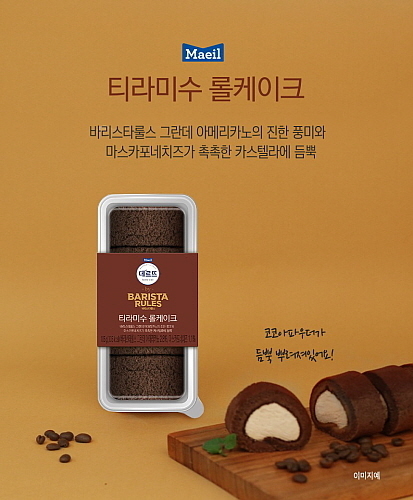 깊고 진한 커피햐의 부드러운 크림에다 은은한 치즈향이 매력적 청정 뉴질랜드산 마스카포네 치즈, 여기에 진한 코코아 파우더를 뿌려 달콤쌉싸름한 맛의 클래식한 티라미수 롤케이크를 완성했다는 것이 회사 측 소개다.