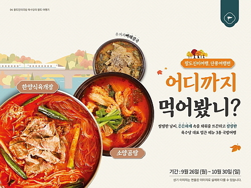 이에 더해 배달 고객을 위한 단풍맞이 세트 메뉴도 마련했다. 단풍맞이 세트 메뉴는 한양식육개장과 소양곰탕, 우거지뼈해장국에 수만두 2알을 추가해 판매하며, 이들 행사는 오는 30일까지 운영된다.
