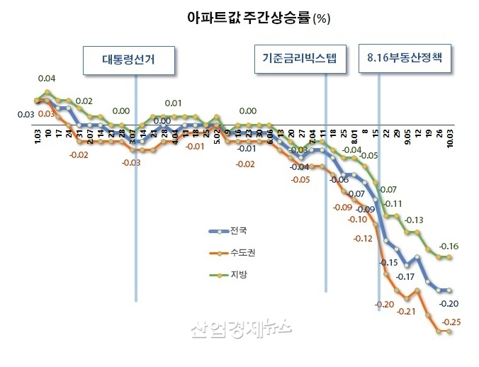 하지만 작년 10월 이후 정부가 금융규제를 강화하면서 상승률이 꺾이기 시작했고, 올해 들어와서는 6월까지 약보합세를 보였다. 그리고 지난 7월 13일 정부가 기준금리 빅스텝을 단행하자 가격상승률은 -0.10%아래로 하락속도가 급해지더니 올해 10월 3일 조사에서는 -0.20%로 하락폭이 크게 확대됐다. 3개월의 짧은 기간에 가격이 너무 급하게 하락했다는 평가다.