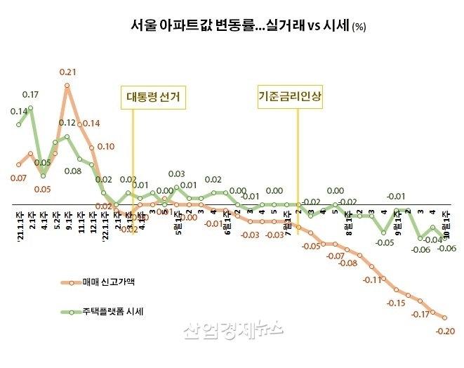 한국부동산원의 아파트가격 변동률이 급락세의 수치를 보이는 가운데, 또 다른 주택가격 조사기관인 부동산R114의 변동률은 한국부동산원의 수치와 큰 차이를 보이고 있다.