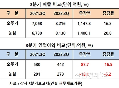 연결재무제표 기준 양사의 3분기 영업이익을 살펴보면 오뚜기가 442억 원으로, 전년 동기 530억 대비 87.7억이 줄어 약 16.5% 감소한 반면, 농심은 273억 원을 시현, 전년 동기 291억 대비 18.1억 가량이 줄어 6.2% 가량 감소하는데 그쳐 상대적으로 선전을 펼쳤다.