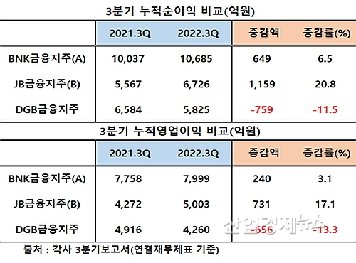 3Q 누적 영업이익 증가율, JB 20.8%→BNK 6.5%→DGB –11.5% 순