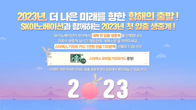 [산업경제뉴스 강민구 기자] SK이노베이션은 부산엑스포 유치 기원의 마음을 담아 부산에서 2023년 계묘년 새해 첫 일출 현장을 온라인 생중계한다고 30일 밝혔다.