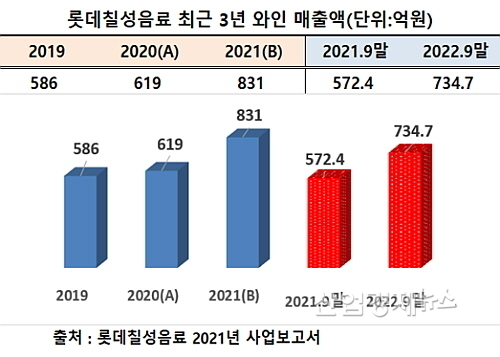 이 회사 사업보고서에 따르면 최근 3년간 와인매출은 2019년 586억, 2020년 619억, 2021년 831억 원을 시현, 전년대비 34.3%나 급증했다.