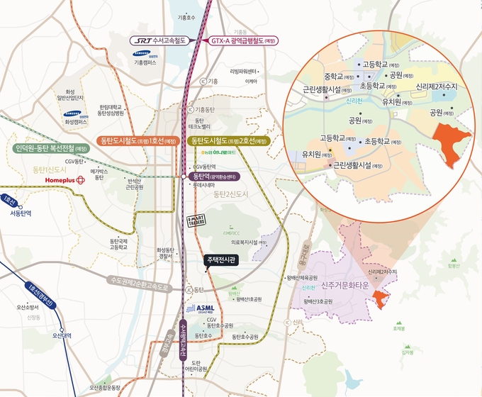 실제 단지와 인접한 동탄신리천로를 통해 동탄호수공원과 상업시설, 학원가 등 인프라를 가깝게 이용할 수 있다. 또 SRT가 정차하는 동탄역을 이용하면 수서역까지 15분대에 이동할 수 있으며, 향후 GTX-A노선이 개통되면 강남 접근성은 더욱 개선될 전망이다.