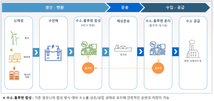 수소에 톨루엔이라는 화학물질을 첨가해 원거리 이동과 저장이 용이한 메틸시클로헥산(MCH) 형태로 변환 후 이송해 수소를 분리 하는 방식으로, 수소가 상온/상압 상태로 유지돼 안정적인 운반과 저장이 가능하다는 장점이 있다.