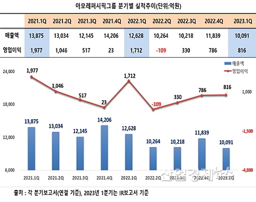 [산업경제뉴스 민경종 기자] 아모레퍼시픽그룹(아모레G)의 1분기 실적이 주력기업인 아모레퍼시픽의 국내외 사업 부진에 휘청, 매출과 영업이익 모두 뒷걸음질 치는 저조한 성적표를 작성한 것으로 밝혀졌다.