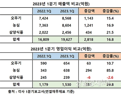 반면에 삼양식품은 지난해 1분기 245억에서 올 1분기 239억 원으로 되레 2.6억 원이 감소했고, 이는 곧 3사의 합산 영업이익 신장세를 깍아내리는 결과를 낳았다.