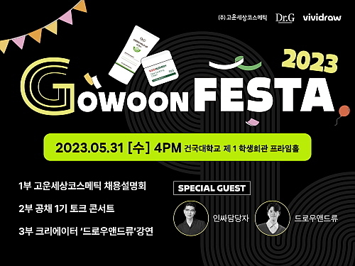 [산업경제뉴스 민혜정 기자] 더마코스메틱 브랜드 ‘닥터지’로 친숙한 고운세상코스메틱이 2023 공개채용을 앞두고 오는 31일 서울 건국대학교 학생회관 프라임홀에서 취업준비생을 위한 채용 콘서트 ‘고운 페스타(GOWOON FESTA)’를 개최한다.