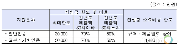 일반인증 분야는 107억원 규모의 사업비를 투입하여 약 1,500개 업체를 지원할 계획이며, 고부가가치 인증분야는 98억 원 규모로 약 320개 업체를 지원할 계획이다.