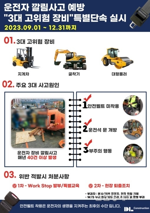 [산업경제뉴스 최기훈 기자] DL건설은 9월 1일부터 중대재해 ‘제로(Zero)’ 달성을 위해 전 현장을 대상으로 안전 활동인 ‘타겟(Target) 1.2.3’을 전개하고 있다.