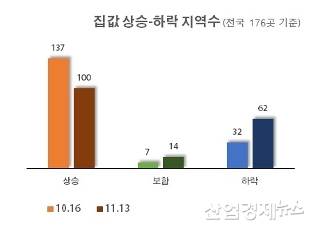 한달 전 10월 16일 기준 조사에 따르면 상승지역은 137곳이고 하락지역은 32곳으로 상승지역이 압도적으로 많았다. 4배가 넘게 상승지역이 많고 상승률도 높았다. 하지만 한달 후인 11월 13일 기준으로는 하락지역 수가 상승지역 수에 가까워지고 있는 추세를 보이고 있다.