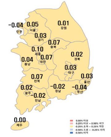 서울에서는 강남과 서초가 그동안의 상승세를 멈추고 0.0%, 0.02%로 보합세를 보였고, 노원 -0.01%, 강북 -0.01%, 구로 -0.02% 등 중저가 밀집지역은 가격이 하락했다.