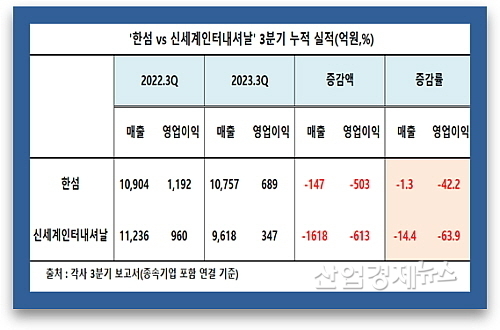 한섬이 3분기까지 689억 원의 영업이익을 올려 전년 동기 1192억 대비 503억이 감소(감소율 42.2%)한 반면에 신세계인터내셔날은 347억 원의 영업이익에 그쳐, 전년 동기 960억 대비 613억 가량 줄어들어 63.9% 감소율을 기록한 것. 두 회사의 격차는 21.7%P에 달했다.
