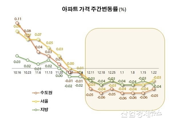 한국부동산원이 1월 22일 기준 조사한 아파트가격 변동률은 전국 -0.05%, 수도권 -0.05%, 지방 -0.04%, 서울 -0.03%로 나타났다.