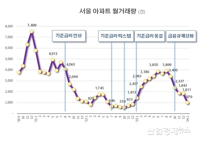 서울부동산정보광장에 따르면 올해 1월 서울 아파트 거래량은 28일 현재 979건에 그쳤다. 지난해 8월 월 3,899건까지 증가했던 거래량이 올해 들어 오자마자 1,000건 아래로 내려 앉았다. 시장에서는 2022년 금리 빅스텝 때의 거래절벽 현상이 다시 찾아 오는 것 아니냐는 우려의 목소리가 나오고 있다.