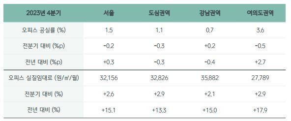 글로벌 종합 부동산 서비스 기업 CBRE 코리아가 발표한 ‘2023년 4분기 국내 상업용 부동산 시장 보고서’에 따르면 2023년 서울 오피스 평균 명목임대료는 전년 대비 8.8% 상승해 역대 최대 상승률을 기록했다. 실질임대료는 명목임대료보다 더 많이 올라 15.1%의 성장률을 나타냈다.