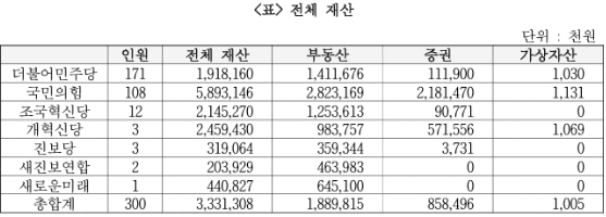 이들의 증권 재산은 평균 8.6억 원으로 국민 평균의 9.7배였고, 여당인 국민의 힘 소속 의원들의 1인당 평균 재산은 약 55억 원에 이르는 것으로 나타났다. 이 수치는 민주당 소속 의원들의 1인 당 평균재산(약 11억 원)의 약 5.5배에 달하는 것으로 분석됐다.