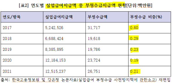최근 5년간(2017~2021년) 전체 실업급여 지급 건수 중 부정수급 건수 비중은 0.29%~ 0.66% 사이에 불과했다. 금액으로 따지면 이 비중은 더 낮아져, 같은 기간 전체 실업급여 지급액 중 부정수급액은 0.19%~0.60%에 불과했다. 1%도 되지 않는 부정수급 사례를 들어 실업급여 축소 여론을 만드는 보수 언론과 정치권은 실업급여 제도의 취지를 훼손하려는 뻔뻔한 선전을 멈춰야 한다.