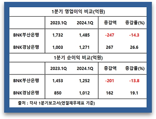 [산업경제뉴스 민혜정 기자] 영남권을 주된 영업기반으로 하는 BNK금융지주 소속 지방은행 BNK부산은행(이하 부산은행)과 BNK경남은행(이하 경남은행)의 올 1분기 손익을 분석한 결과, 설립연도나 자산 규모 등에서 아우격인 경남은행이 더 나은 성적표를 내민 것으로 나타났다.