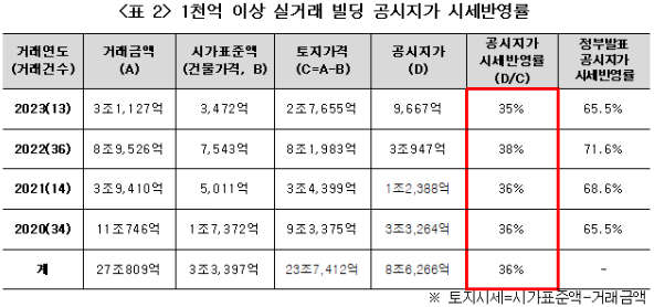 경실련이 발표한 빌딩 공시지가 시세 반영률을 연도별로 보면, 2020년 36%, 2021년 36%, 2022년 38%, 2023년 35%로 나타났다. 이에 비해 정부는 연도별 전국 공시지가 시세반영률이 2020년 65.5%, 2021년 68.6%, 2022년 71.6%, 2023년 65.5%라고 밝혔다.